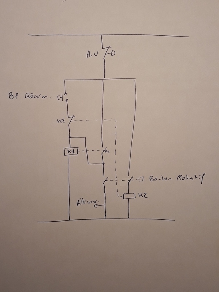 - Au retour de la tension, il faut appuyer sur le bouton de réarmement pour réactiver K1. Mais si j'ai oublié de mettre le bouton rotatif sur 0, K2 inhibe le démarrage.