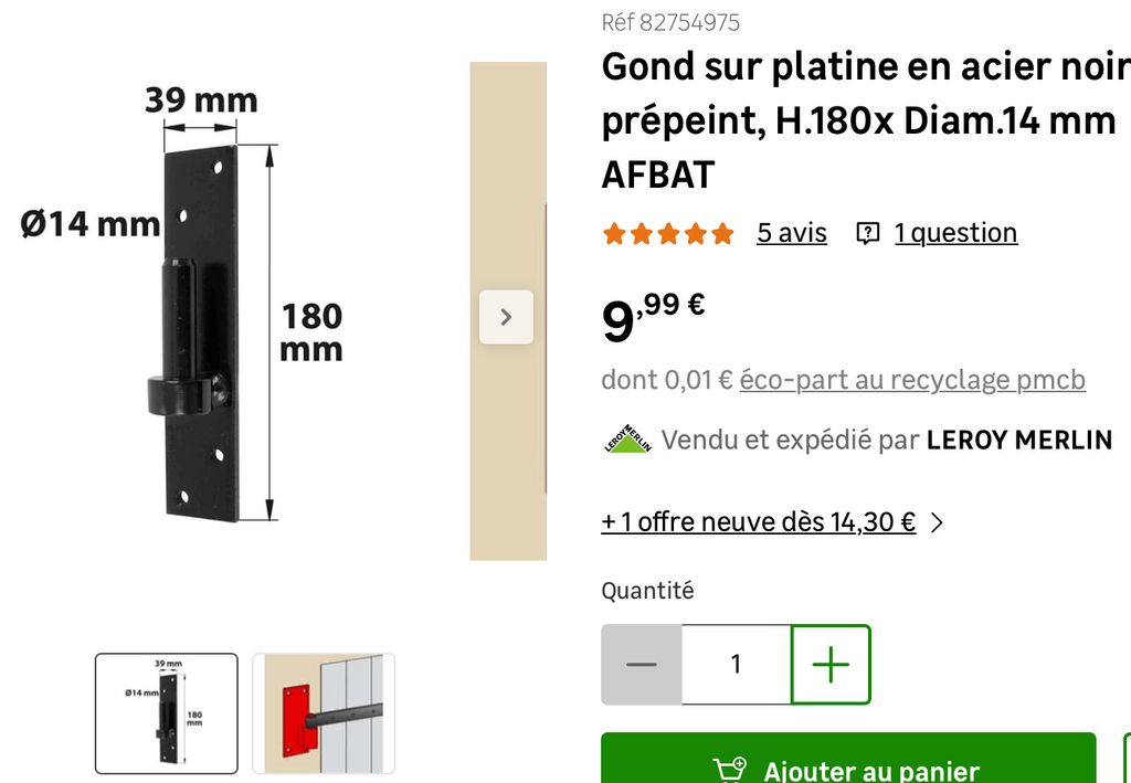 2 gonds en 14mm ça devrait suffire oui. Si au montage t’as la sensation que c’est trop juste tu peux rajouter un 3ème. C’est le nombre de points de fixations qui est décisif à mon sens, plutôt que le diamètre du gonds car les longueurs (84mm) et diamètres des vis (10mm) sont identiques.