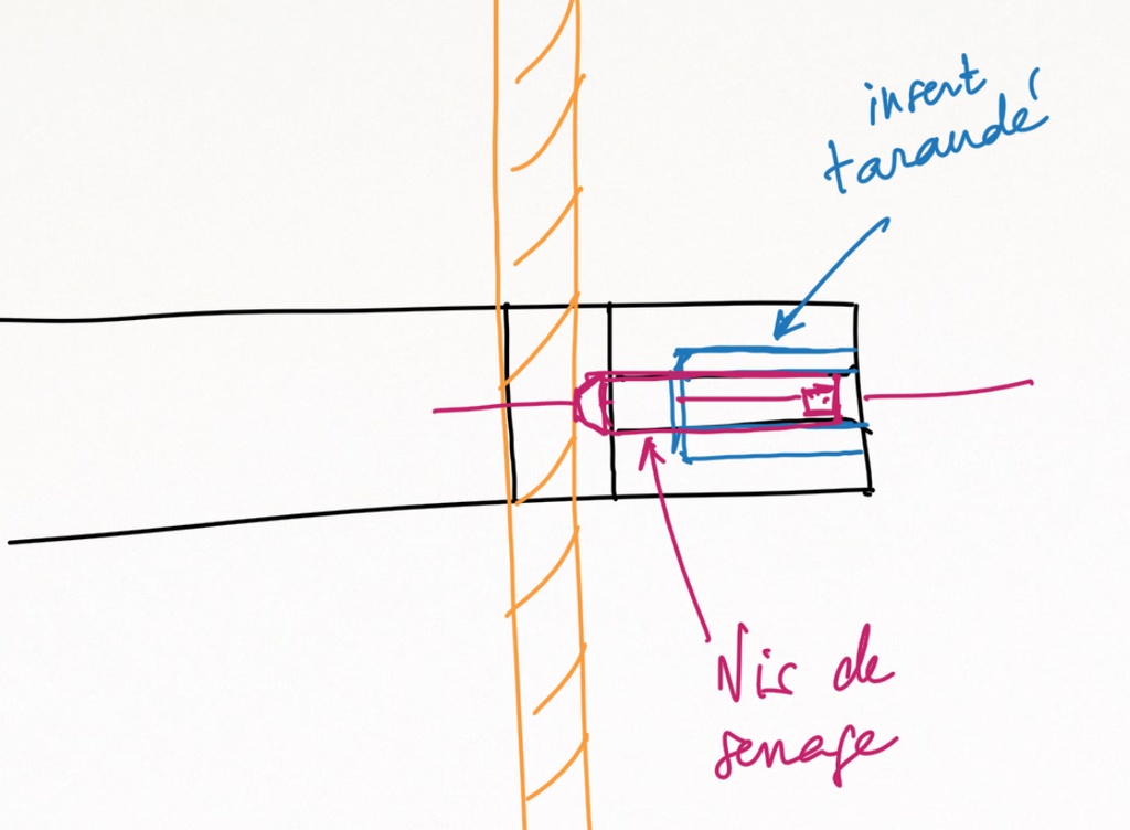 Sur chantier, j’ai un gabarit maison en chêne qui ne s’use pas trop vite. Une fois le trou bien entamé, j’enlève le gabarit pour continuer à creuser et mieux voir la profondeur.