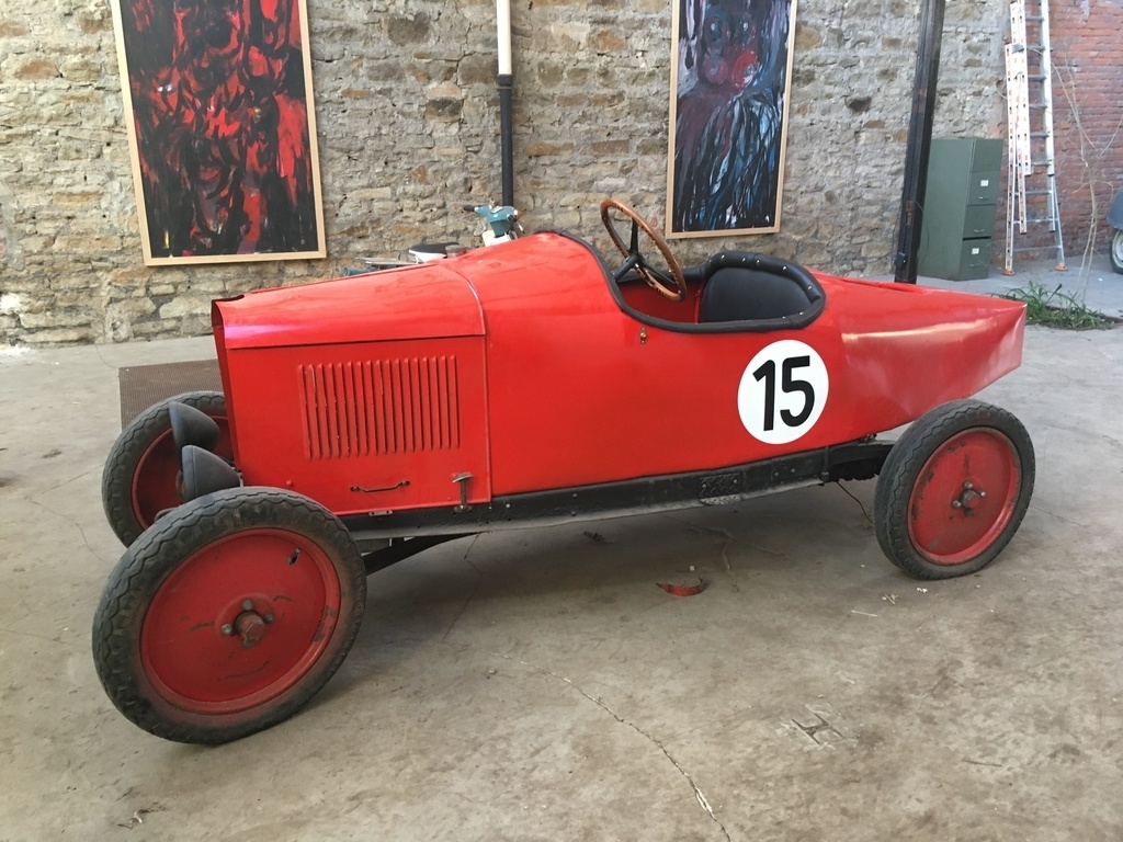 Le machin rouge derrière c’est la crise de la cinquantaine de mon collègue, une très vieille Peugeot qu’il retape tout doucement.