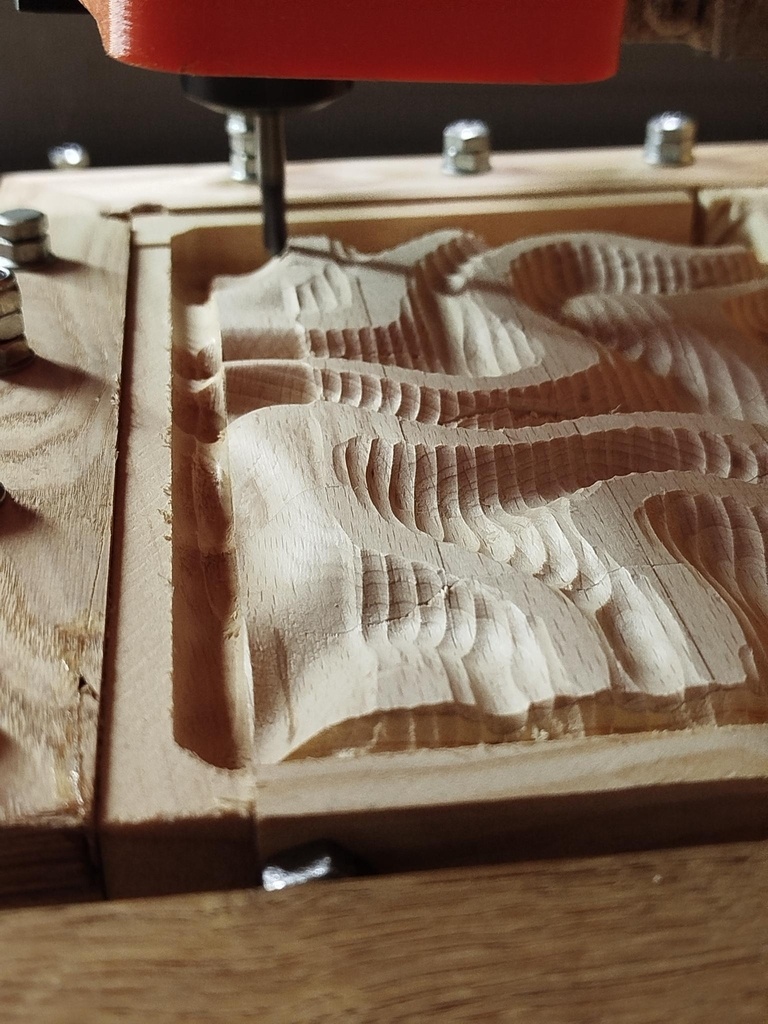 Ebauche lignes de niveau : fraise cylindrique de 8 ; 12 000 tr/min ; Avance 1400 mm/min ; recouvrement 0.4 ; passes de 2 mm ; surépaisseur 0.5 mm