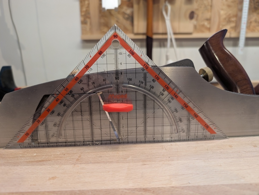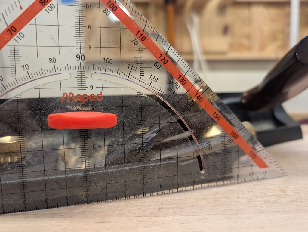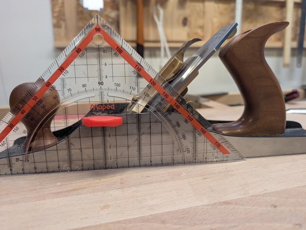 - l'angle de la lame. Sur le rabot à recaler, la lame est incliné à environ 15° par rapport à la semelle et cela est combiné à une inclinaison verticale de 20° ce qui a pour effet d'aplatir encore plus la lame par rapport au bois. Tout cela pour dire que le rabot à recaler sera donc très performant sur du bois de bout.