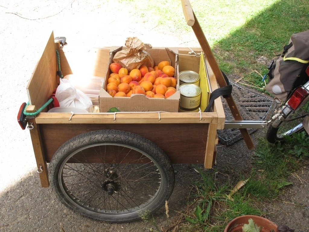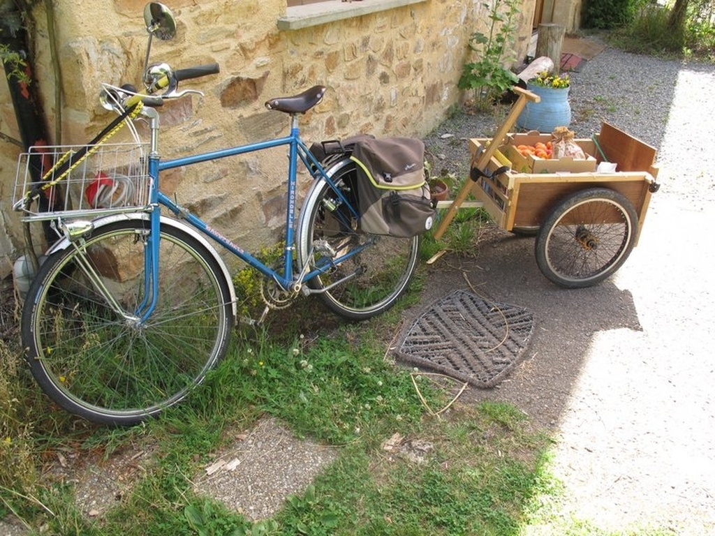 la remorque et son système d'attelage ont été améliorés depuis la photo, tout en gardant les mêmes principes. Sur la photo, la liaison est faite par un gros mousqueton tournant (normalement pour attacher des veaux), que j'ai changé maintenant.