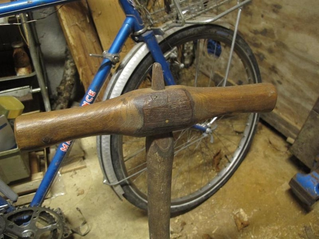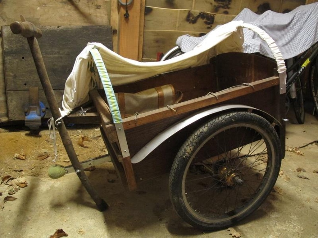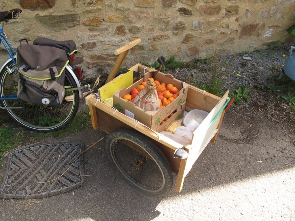 J'ai rajouté des garde boue en plat d'alu, des arceaux pour une bache, et changé la barre qui sert de béquille en partie basse et de poignée de traction à la main en partie haute. C'est une branche de houx, laissée presque brute.
