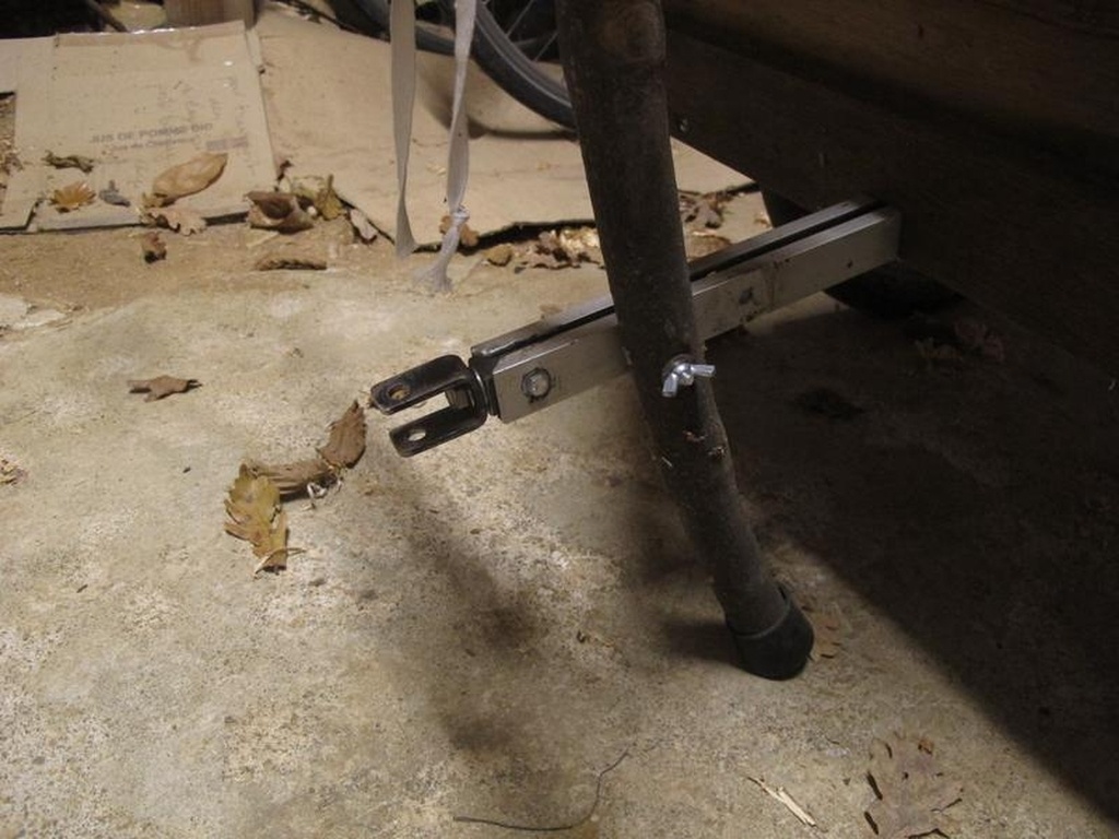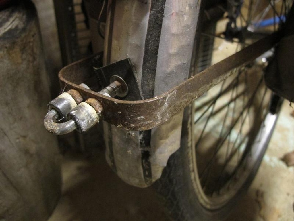 et sur le vélo, un crochet à l'arrière du garde boue, avec une barre d'acier cintrée et cambrée qui assure la liaison entre le garde boue et sa liaison sur la fourche de roue arrière.