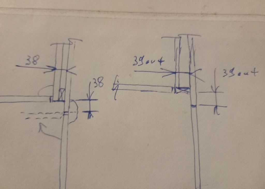 Pour le meuble gauche, ta joue de droite est aussi plus large que le meuble, pour venir sur le même plan que le parement de la porte, et 1 fileur de 19mm y est fixé (ce qui fait donc 38mm). Le chant étant à plaquer sur toute l'épaisseur (à voir ce que tu prévois d'utiliser, comme chant. Si tu peux en avoir d'assez large, etc).
