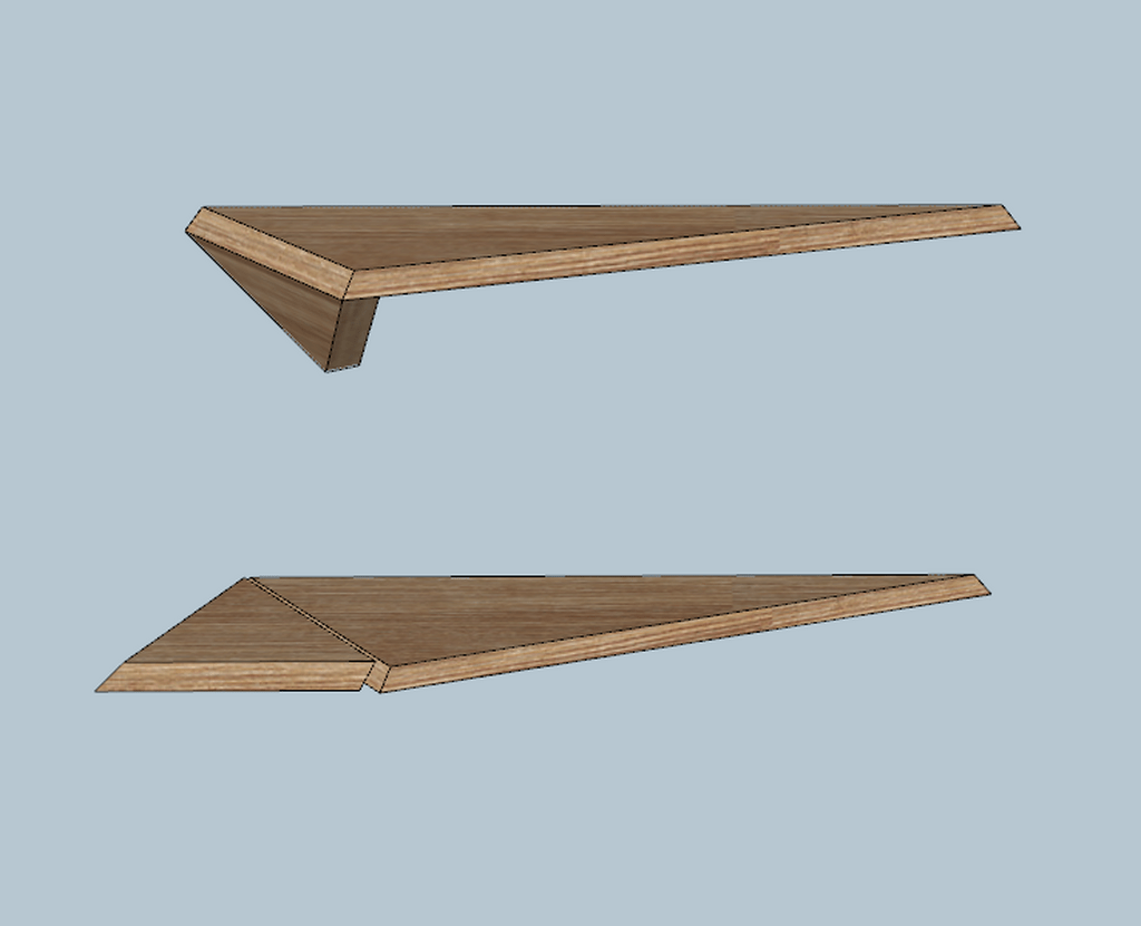 L'angle total est inférieur à 90°, donc il faut créer des pointes plus fines que 45° dans les deux pièces pour cacher le bois de bout et c'est toujours beaucoup de chipotes. Ici j'essayais de faire un truc facile à fabriquer.