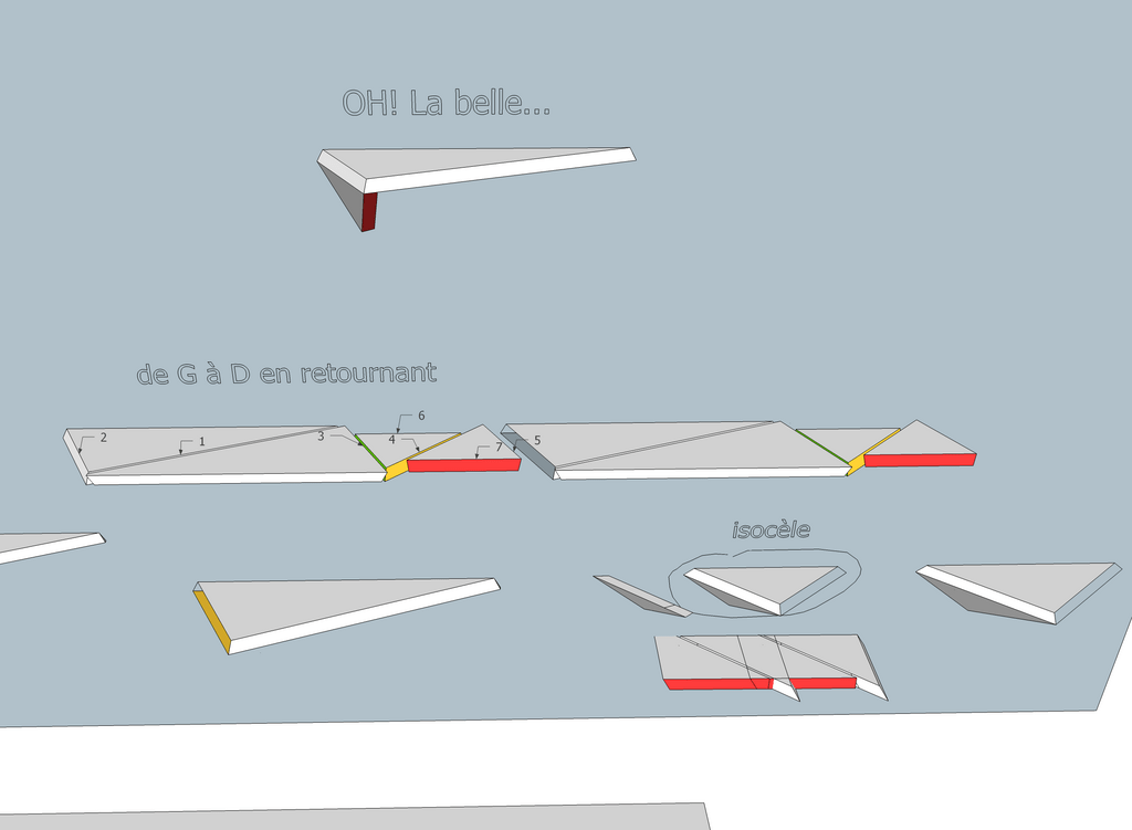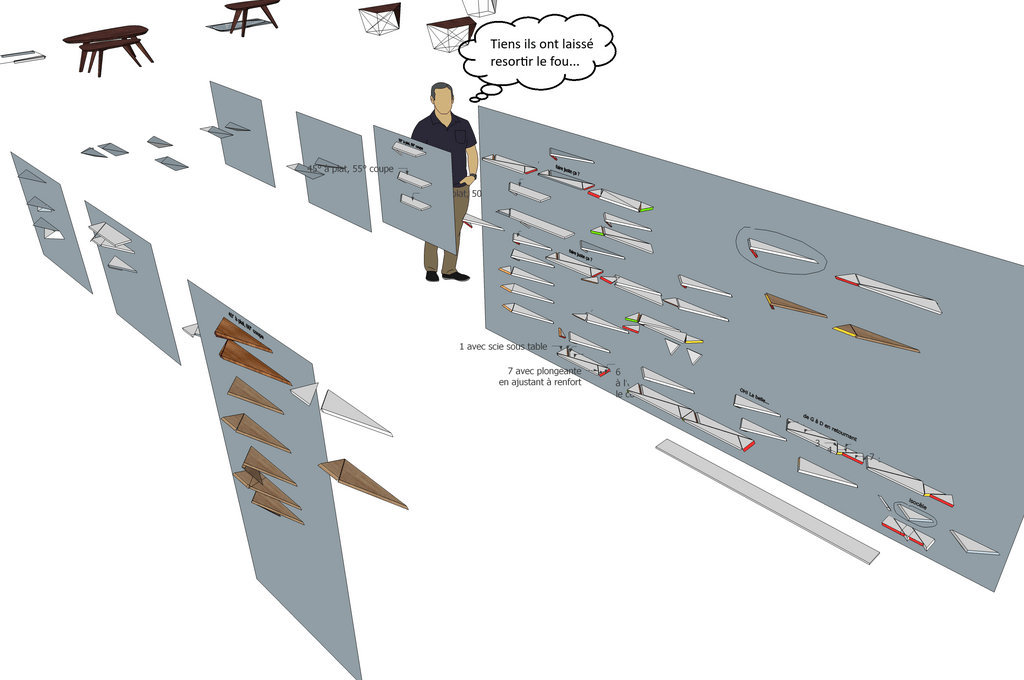 Des heures et des heures sous SketchUp... Surtout pour les agencer sur une planche. Voici le bordel que ça donne :