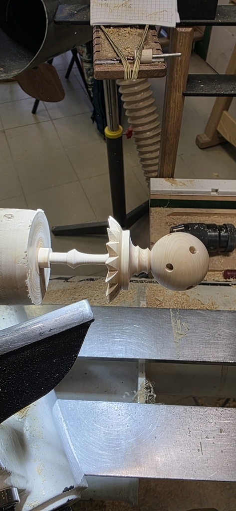 pas vraiment de tracé, on prend l'axe de la sphere extérieure qui donne la position de la sphère intérieure. on fais un percement au niveau du pied pour le passage de la petite sphère en calculant la longueur du pied pour qu'elle soit dans l'alignement. un peu d'indexeur pour les percements. la sphère principale est juste posée sur le pied. les percements des pointes se fond avec les deux sphères en place et un gabarit pour la mèche de 6mm
