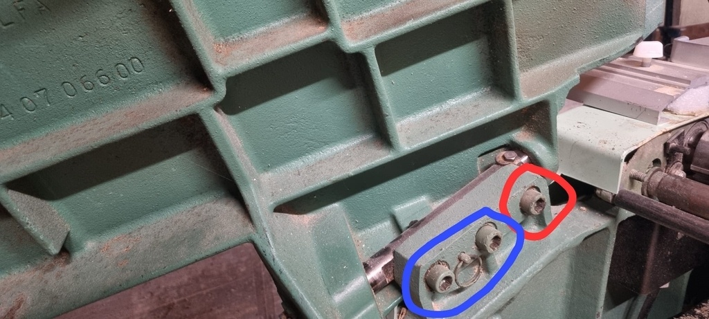Perso mon combiné est un Lurem, pour régler le genre de soucis que tu as si je lève ma table d'entrée elle est fixée au bâti par 3 boulons (en bas de la photo). En desserrant les 2 bleus légèrement et le rouge très très légèrement, je suis capable d'orienter ma table afin de la faire plus ou moins piquer du nez dans un sens ou un autre (l'idée étant évidemment de l'orienter pour qu'elle ne pique du nez dans aucun sens). Quand je suis bon (c'est plus facile à 2 de le faire) je ressers tout et vraiment fort, mais vraiment, j'ai une clé à levier long pour multiplier la force.