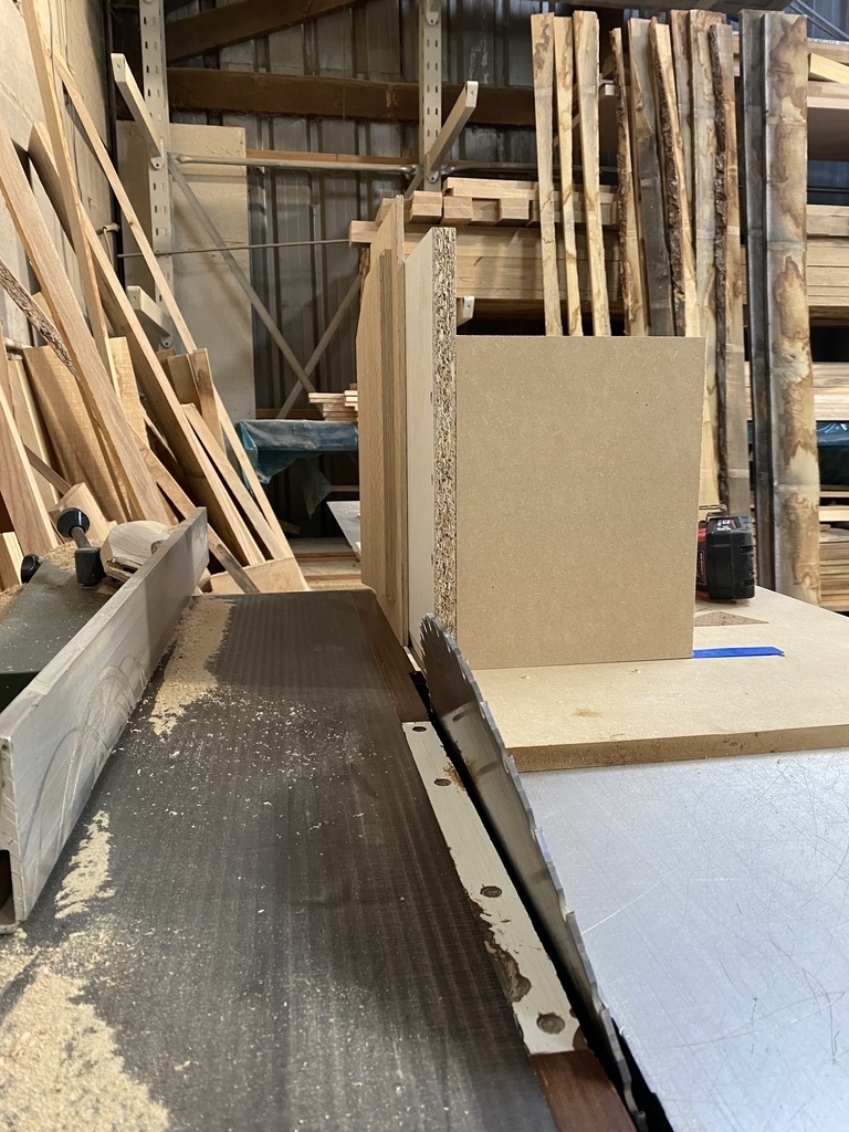 J’ai utilisé une scie à format oui pour évider l’intérieur de mes panneaux. Il faut juste trouver l’angle pour guider la pièce en travers de la lame de scie et bien dégrossir le travail avant pour ne pas avoir de soucis