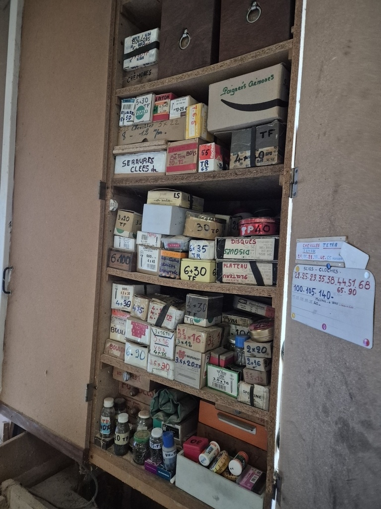 Il fait environ 160 mètres carrés, avec machines anciennes, outils neufs et anciens, quincaillerie, outils de collection.