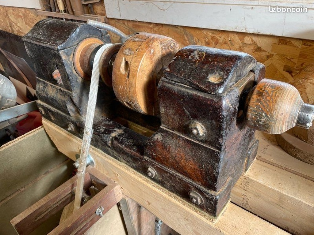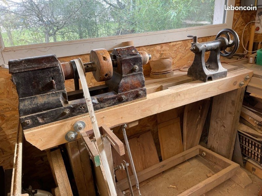 Bonjour. Je me sépare de ce magnifique tour à bois car je manque de place. Il était au départ dans un atelier à l'ancienne, relié par une courroie à un arbre au plafond qui faisait tourner toutes les machines de l'atelier. Il a ensuite été modifié pour fonctionner avec un pédalier. Possibilité de l'équiper facilement d'un nouveau moteur. À vendre avec ou sans piètement, avec ou sans pédalier. Prix indicatif et négociable , n’hésitez pas à me transmettre votre offre! Me contacter pour plus d’infos