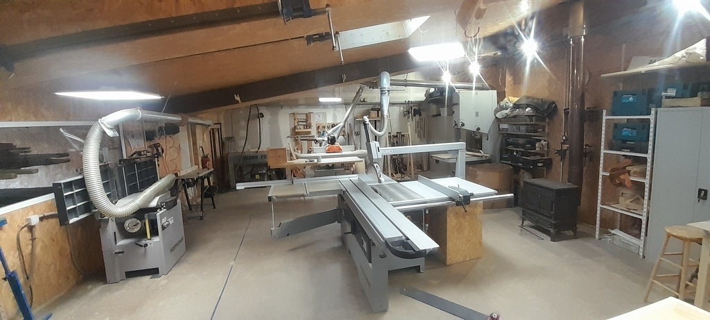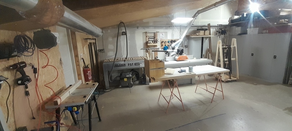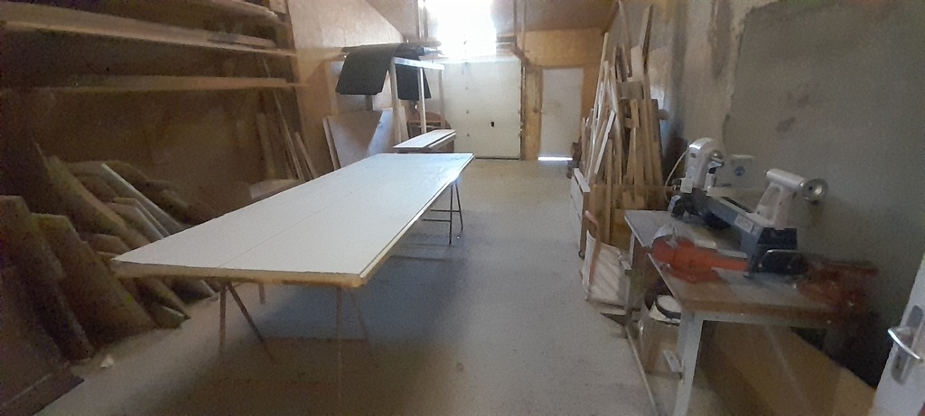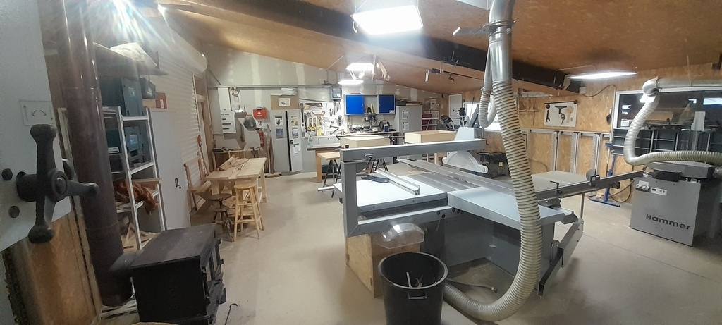 L’atelier de 150m² est équipé d’un parc machine neuf (dégau/rabot, toupie, scie à format, tour à bois, scie à ruban, table aspirante de ponçage, perceuse sur colonne, système d’aspiration centrale, parc de stockage bois, armoires de rangement)