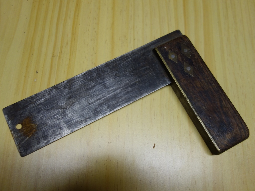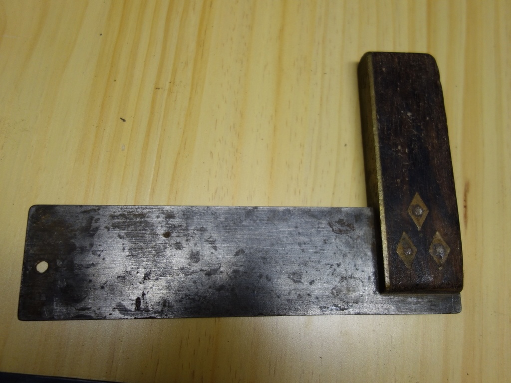 Equerre en acier, laiton et palissandre (?)
