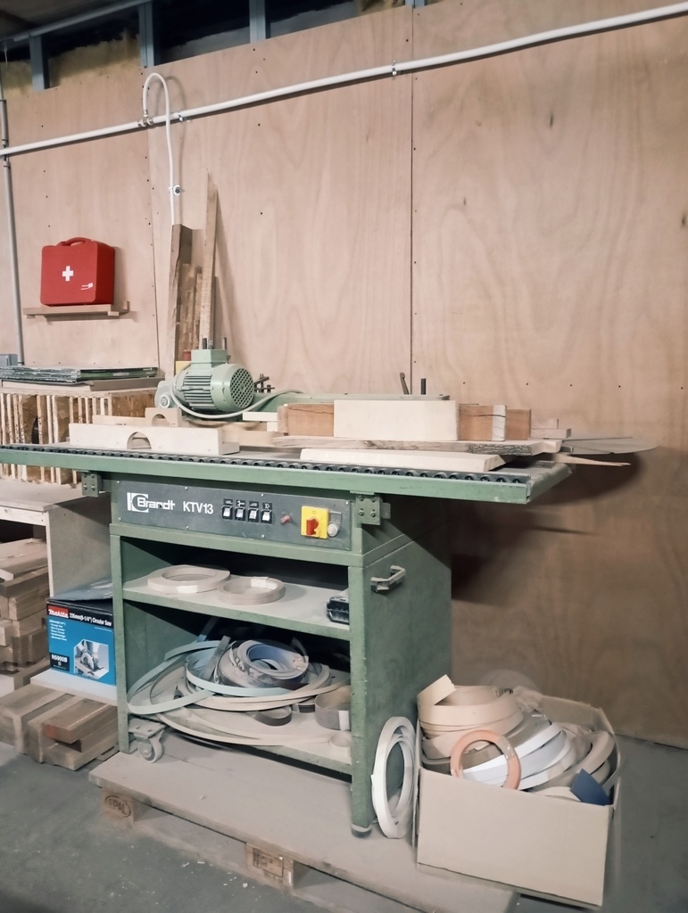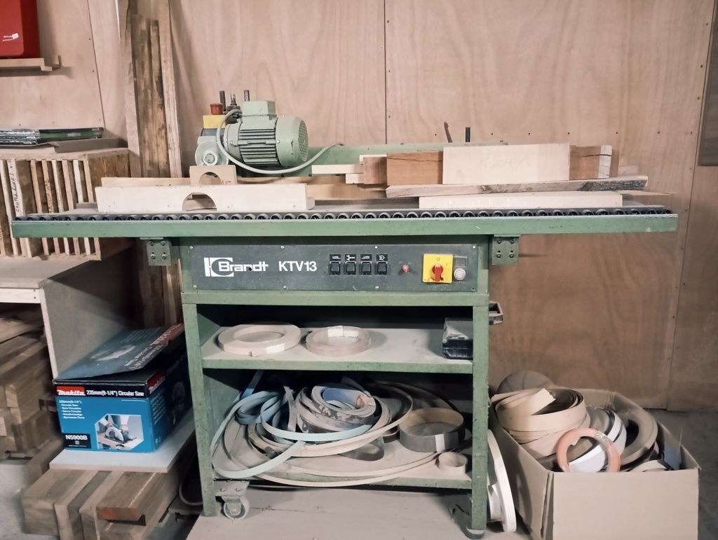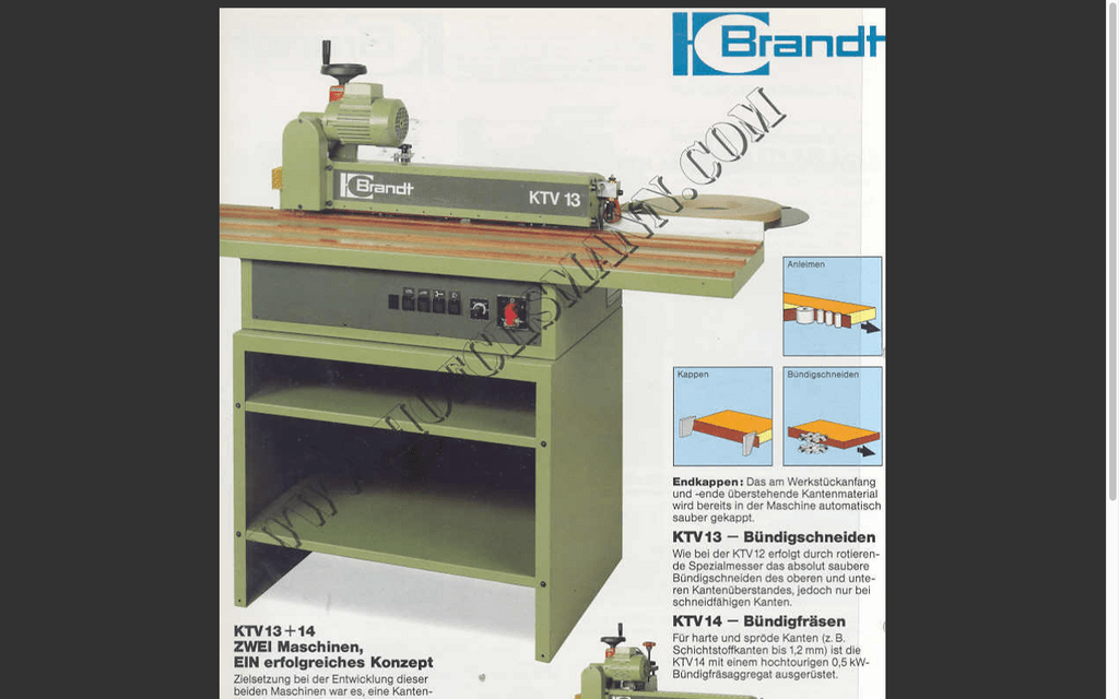 Plaqueuse de chants pour matériaux à chants pré-encollés produite aux alentours de 1990. Elle fait partie de la série KTV de BRANDT. Brochures et notices techniques disponibles via le portail du groupe (notices.groupebrandt.com).