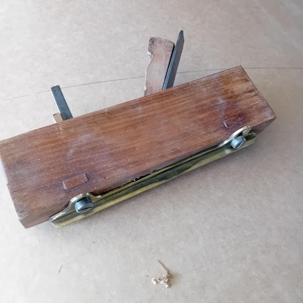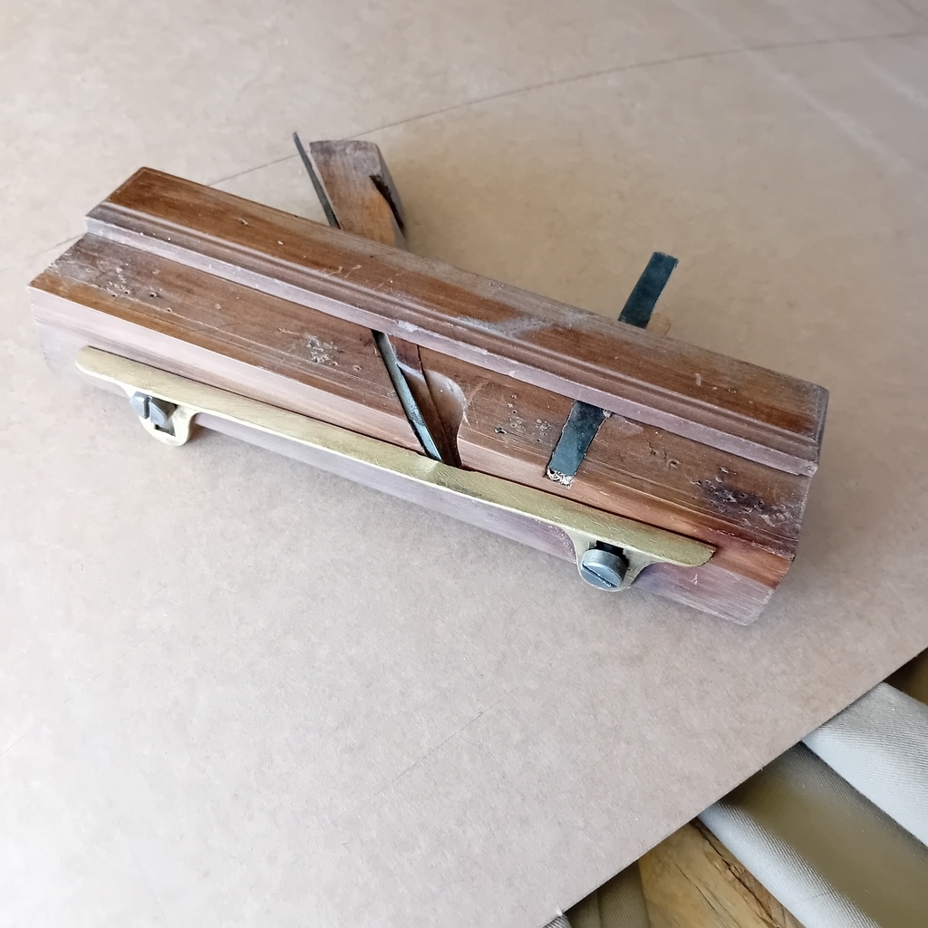 feuilleret en cormier , bois sain sans piqures d'insectes, fer Coulaux coupe biaise de 21; affuté et révisé. L'outil est réglable en largeur par un guide latéral en laiton et dispose d'un grain d'orge.