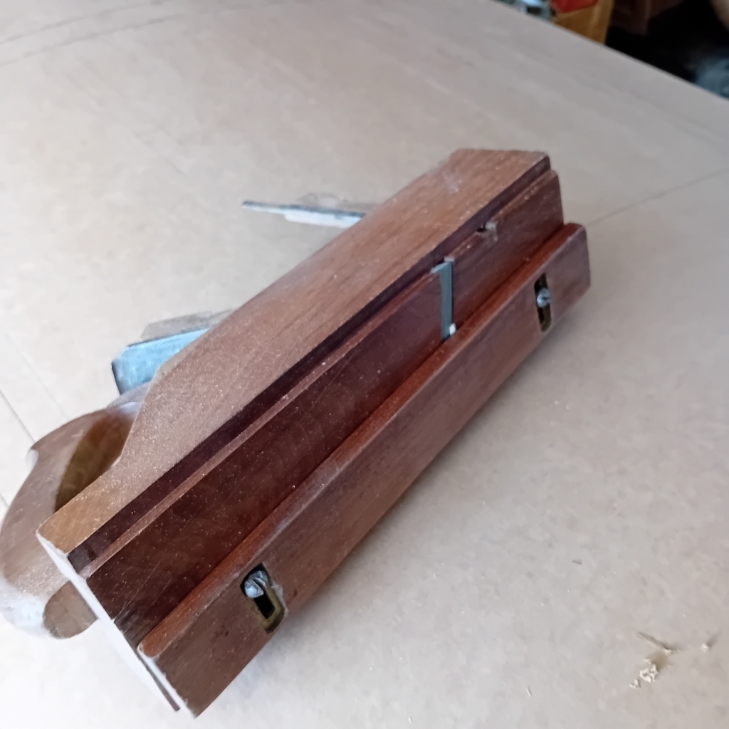 Le fer de marque Goldenberg fait 52 mm de large en coupe biaise. Il est également muni d'un grain d'orge qui évite les petits éclats sur le chant créé. L'outil possède une bonne inertie de par son poids.