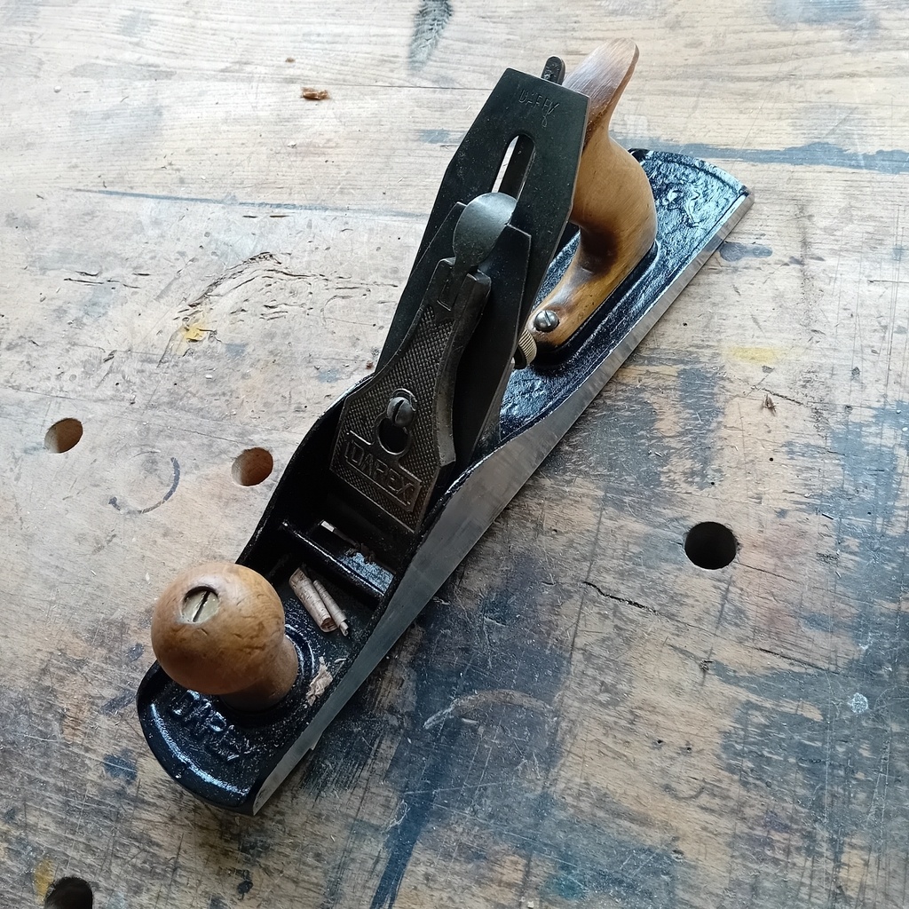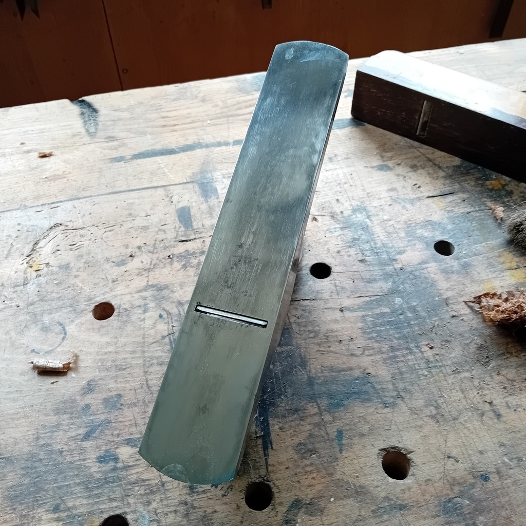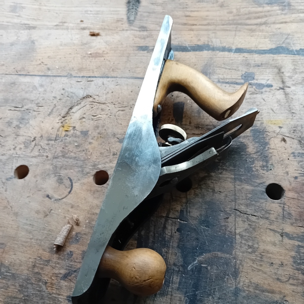 Il est entièrement revisité, semelle rectifiée, affuté, nettoyé, poignées revernies bref il est dispo pour reprendre du service. Il fonctionne très bien et fait de jolis copeaux: un bon outil qui fera le même travail que d'autres rabots de marques connues mais bien plus onéreuses.