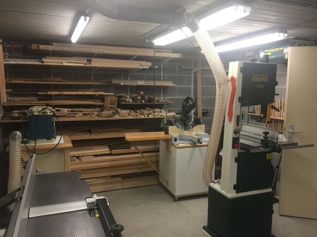 Voici quelques photos de mon premier atelier, là ou maintenant j'ai installé ma scie sous table. A l'époque cela convenait très bien. La passion du travail du bois m'a poussé a acheter progressivement plus de matériel et l'espace n'était plus assez grand... déménagement dans la plus grande cave.