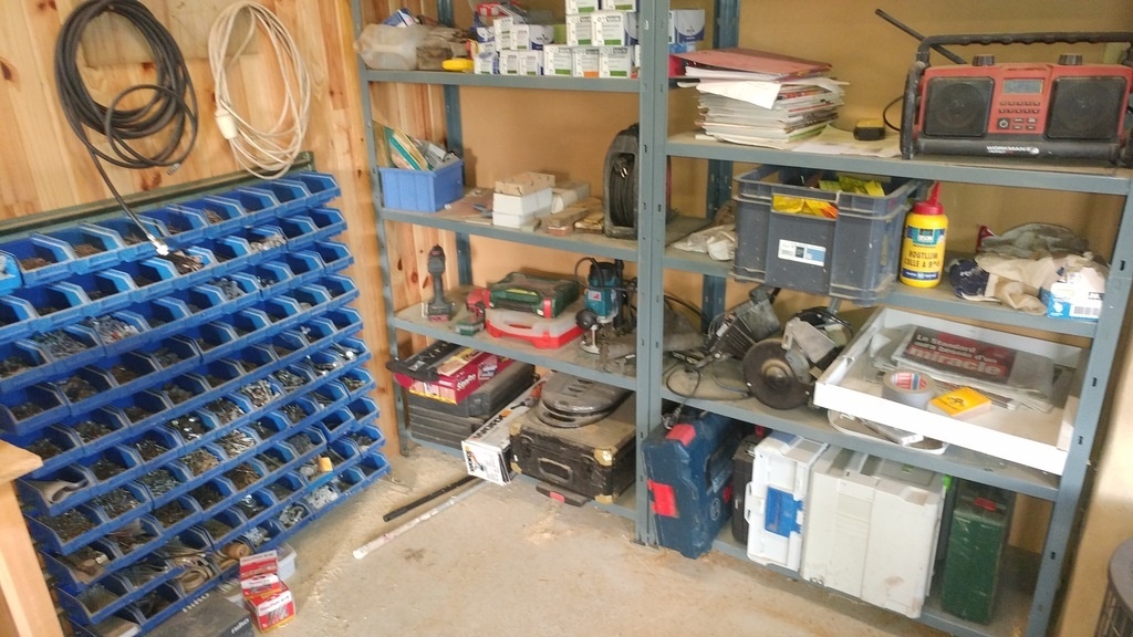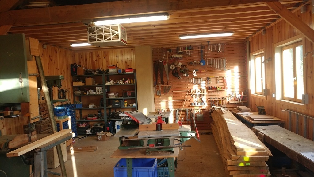 Hormis cela, je dispose de l'outillage standard, la plupart acheté d'occasion. Les rangements sont en 'French Cleat'. J'ai aussi récupéré le vieil établi de l'ancien menuisier du village.