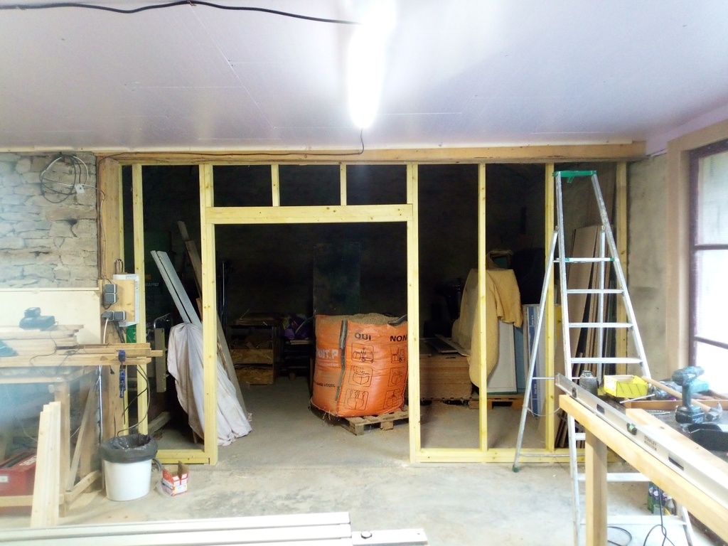 Après avoir mis un poêle Deom turbo, je me rend compte que le volume a chauffer est colossal, et l'isolation inexistante, j'ai donc décidé de réduire mon atelier en créant un faux plafond et des cloisons. J'ai hésité car on a toujours besoin de plus de place, mais après avoir bien galéré avec l'humidité, les températures et l'impossibilité de faire des collages, j'ai sauté le pas. L'espace chauffé fait 60m2.