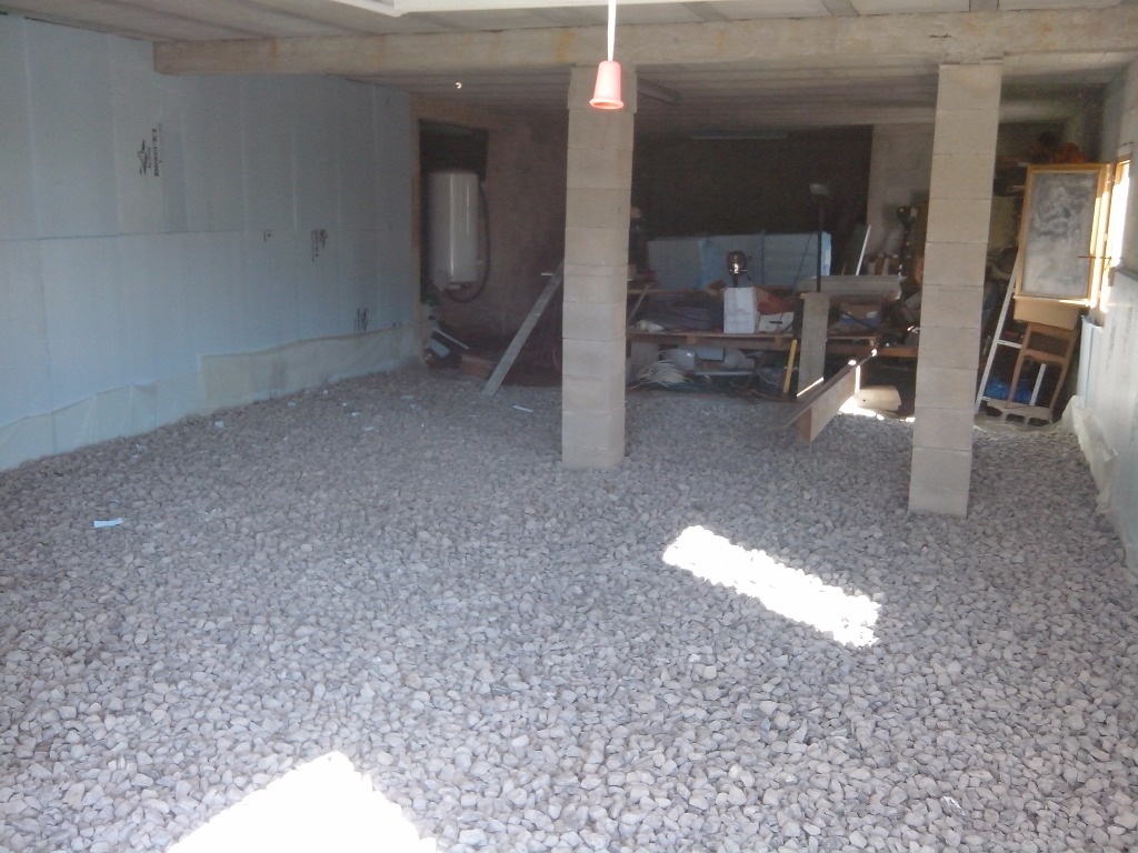 Ayant de l'eau par infiltration et par la présence de petite résurgences dans la roche, j'ai du drainer tout le sol avec des cailloux avant de couler la dalle. J'ai également isolé les murs avec du roofmate, changé le fenestron pour une fenêtre plus grande, puis monté les contre-murs en ciporex de 5cm.