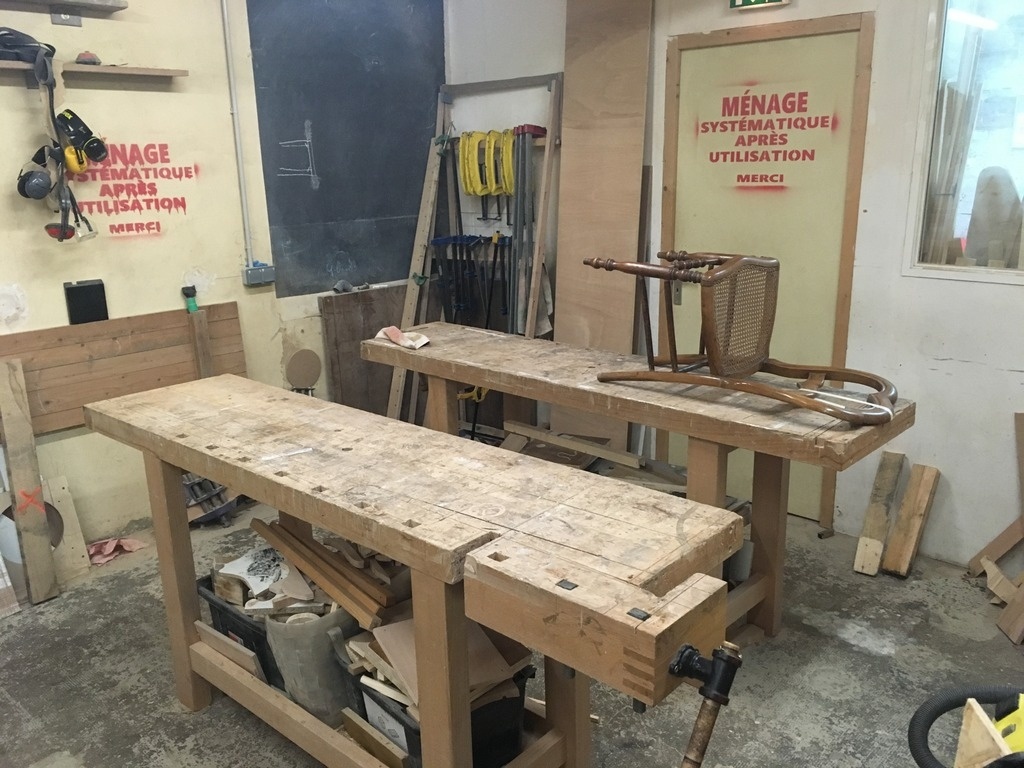 Paris oblige, la place est comptée. Les espaces d'établi se trouvent au sous sol, mais offrent pour autant une ambiance propice à faire des copeaux :)