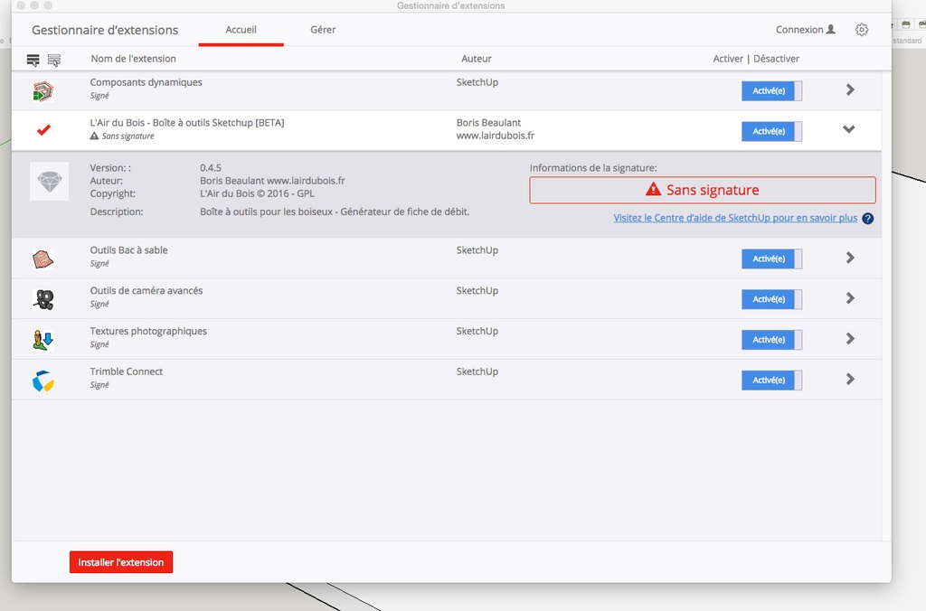 Sinon, le fichier depuis la page de l'extension n'est pas le même parce qu'il est signé par Trimble suite à leur vérification.