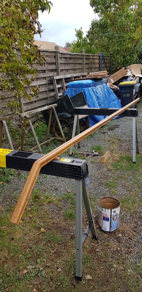 Bricolage d'une main courante et mise en place de renforts de cloisons Placo. Les vis des supports de rampe traverse la cloison pour venir se fixer dans les demi poteaux
