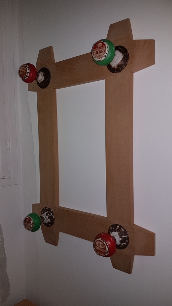 Après ponçage, réservations pour les inserts d'encastrement des patères, collage des montants et traverses puis collage des inserts à l'époxy (j'étais pressé :p). Montée en grain dans les ponçages jusqu'au 240, vernis et égrainage (2 couches).