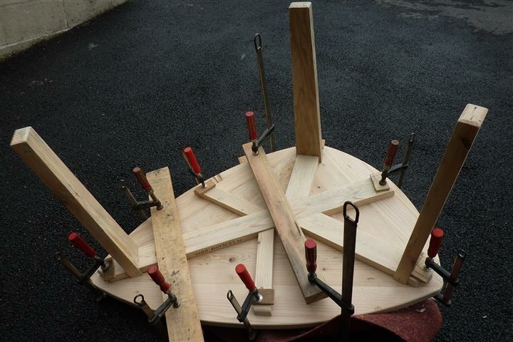 une charge centale sur le plateau tombe sur la jonction des 3 traverses concourantes :un assemblage delicat pour obtenir de la soiidité j'ai remedié à ce probleme surs mes tables gigognes et d'ajout de traveres suplementaires pour les portes à faux des 3 rives tes tourillons en biais (queues d'aronde) pour mieux de surpente des parties en console beaucoup de reflexion pour la solidité (une formation charpente et des cours de resistances de materiaux pour etablir des dessins projet danS le B.T.P. .. tenons multiples pour traverses sur pieds pour un maximum de surface de collage donc tenir le bon angle (pas de liens de contreventement )