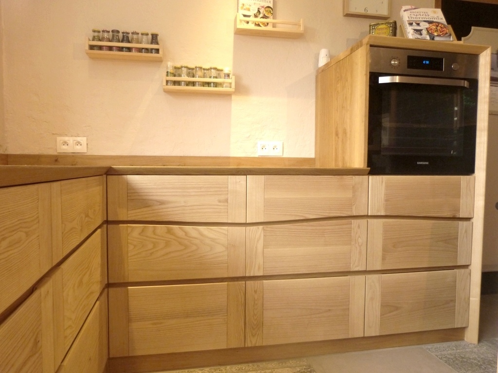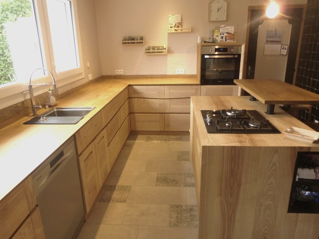 Cuisine avec plan de travail en frêne pour l'ilot central et chêne pour le meuble principal avec essence des façade croisée par rapport au plan.
