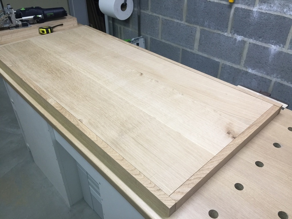 Je voulais plus d’épaisseur visible sur le côté du plateau, le plateau est +- à 24mm d’épaisseur. La ceinture fait +- 30mm. En même temps, cette petite ceinture apporte un petit look différent que l’on aime bien. Concernant les contraintes du bois, ce sera plutôt la ceinture qui est à contrefil qui risque de bouger, j’ai mis des domino’s en fraisant plus large. Le tout collé. Je suis bien d’accord sur le principe, c’est risqué. On verra dans le temps... Voici quelques photos complémentaires.