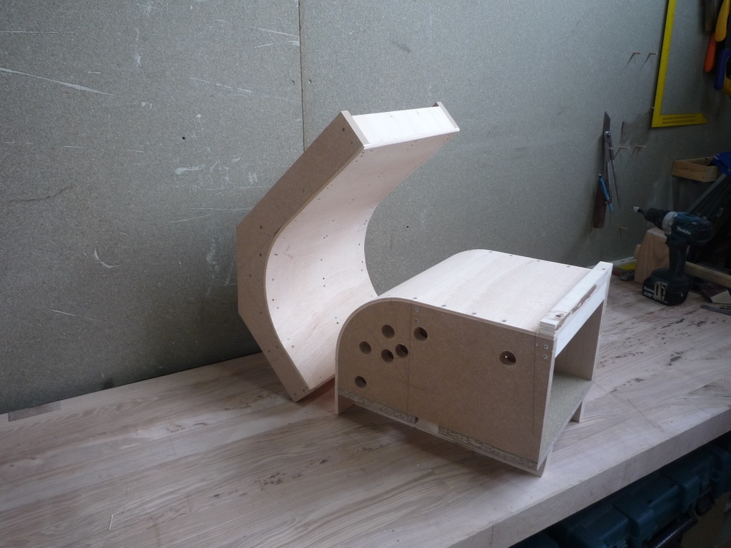 Les façades courbes sont constituées de 3 plaques de CP cintrable de 6mm collées ensemble, sur un moule/contre-moule.