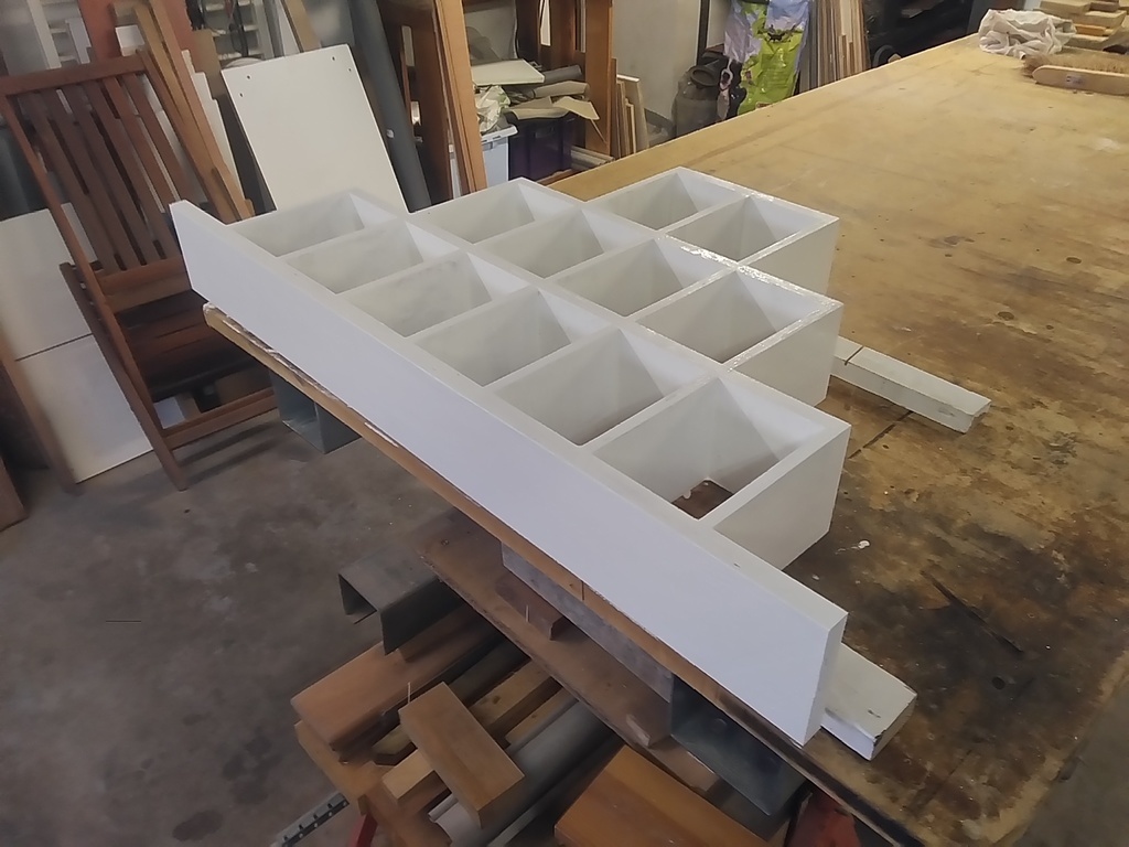 Je voulais une fixation invisible mais pas assez d'épaisseur de planche donc il a fallu ruser j'avais donc une longueur de cornière que j'ai coupé et visser par l’intérieur du caisson une fois peint sa ne se voit pas trop.
