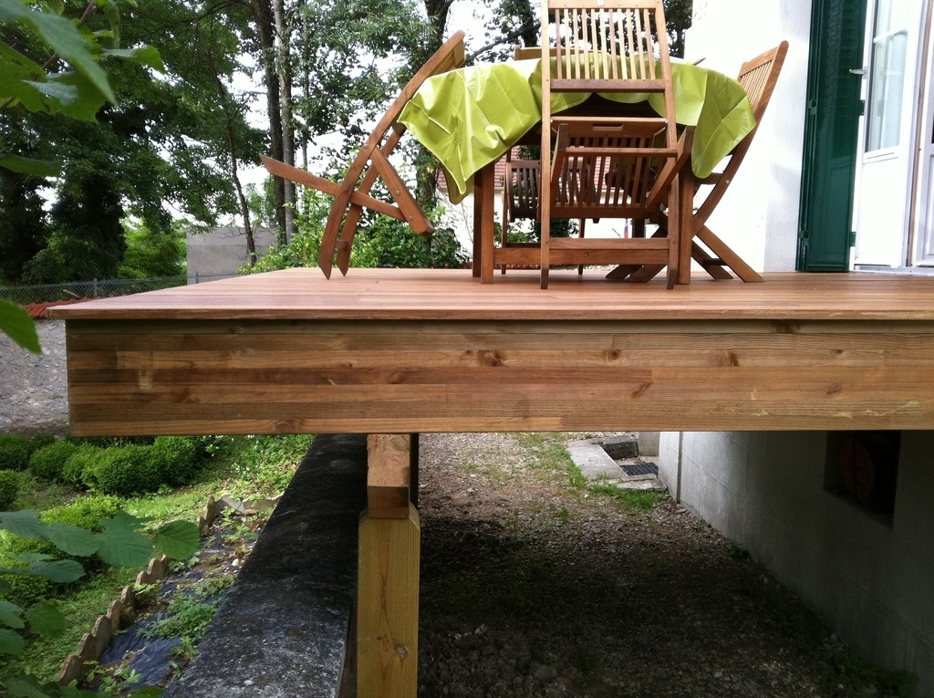 Réalisation d'une petite terrasse sur pilotis à Combs La Ville (77 Seine Et Marne). Structure en lamellé collé autoclave classe 4. Lames de terrasse en ipé.