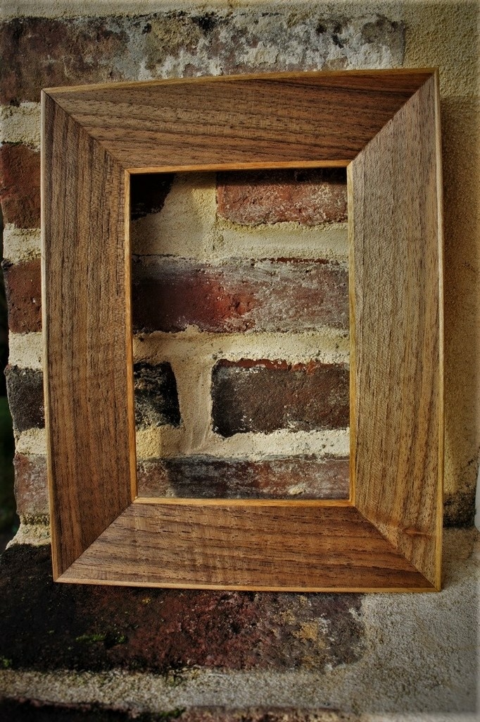 Un petit cadre photo en noyer et merisier pour mettre en service la planche à recaler. Plutôt simple, chanfreiné en arêtiers. Les pentes, feuillures, collages des filets sont réalisés avant de découper et recaler les onglets. Sur les trucs sans effort comme ça, si les onglets sont bien jointifs, on peut se permettre de coller sans serrage (ce que j'ai fait).