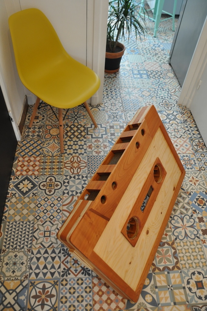 Ici une table basse k7 réalisée pour un copain musicien, fabrication avec des chutes de Merisier et CP, le corps et creux. Essentiellement pointé et collé par manque de temps.