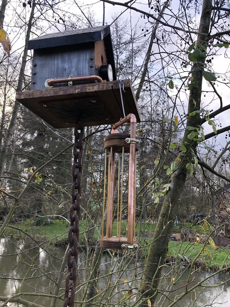 Voilà une maison d'oiseau SteamPunk mise en placeSur un pied en chaîne soudée.Mangeoire à boules SteamPunk