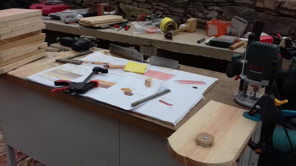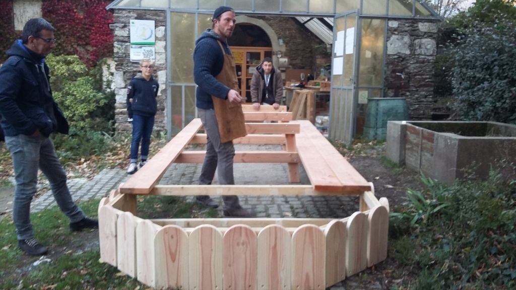 Aménagement extérieur d'une table de pique nique avec jardinières et bacs .