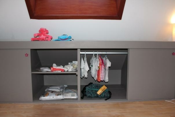 Armoire en MDF peint réalisé dans les combles d'une toiture. Les portes sont coulissantes sur rail et guidées dans des rainures dans le panneau inférieur. Le rail fait toute la longueur afin de pouvoir éventuellement ouvrir deux portes adjacentes.