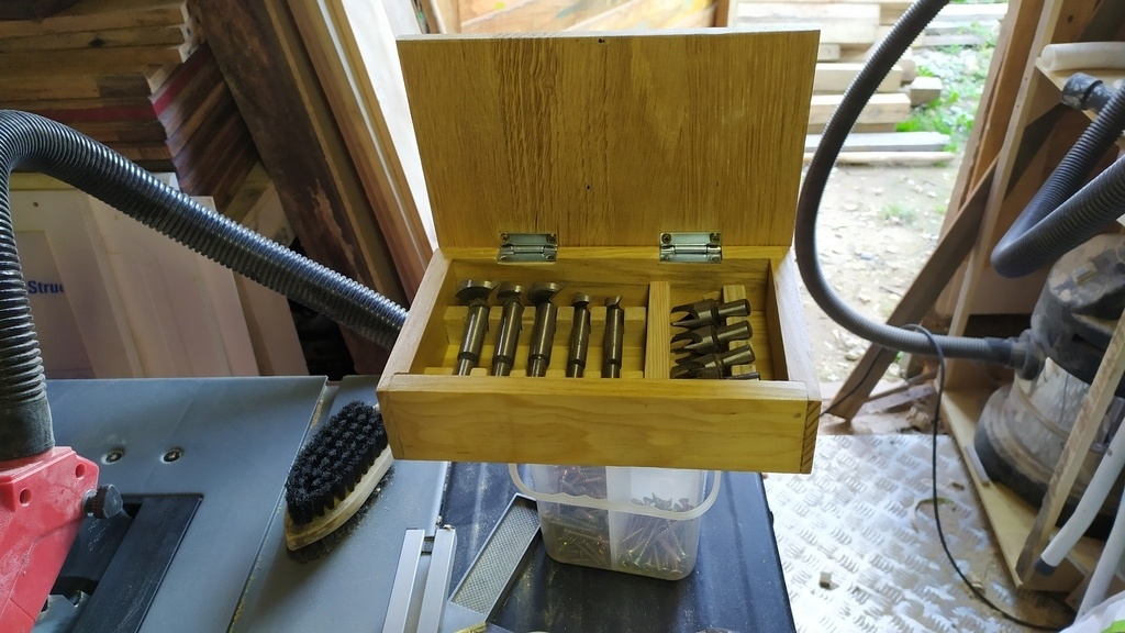 boite pour forets foster et mèches a bouchon fait avec des chutes de sapin et une chute de porte de meuble