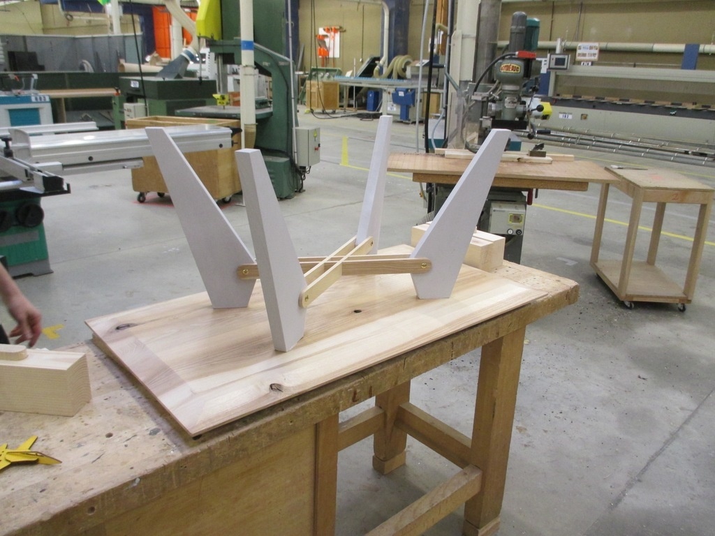 Pour le choix du bois, nous souhaitions du frêne pour le ménage marqué et la couleur claire. le stock de l'école n'était pas de très bonne qualité mais nous avons volontairement conservé des noeuds et différences de teinte. Nous avons ensuite laqué les pieds pour donner un peu de contraste.