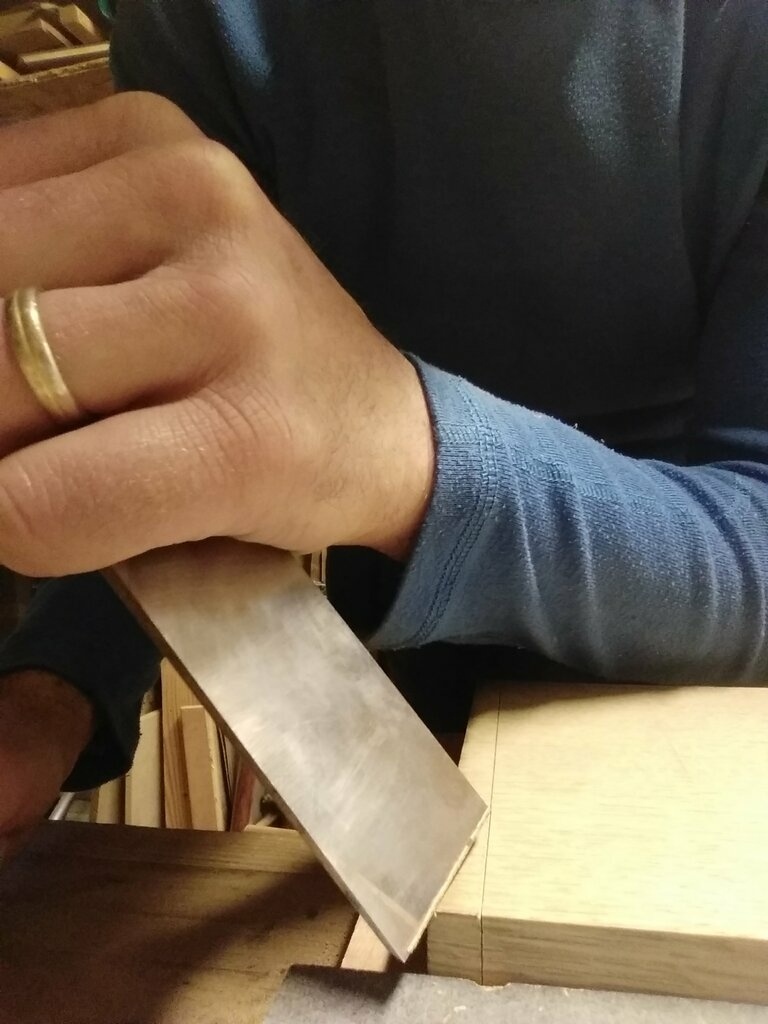 +1 pour la corne. Et même la poignée en fait. Classiquement on n'en trouve que sur des feuillerets à plate-bande, au fer bien large. Là je suis pas sûr que ça se justifie. Perso, j'ai opté pour un design plus proche des bouvets à approfondir. Dans son bouquin, on voit bien que le design de Tom Fidgen est lié au fait que son prototype n'avais pas de joue mobile.