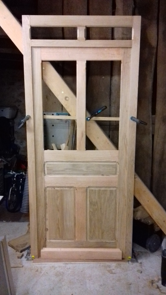 J'ai passé 1 mois à dessiner des plans pour réaliser une porte. Puis, j'ai passé les 2 mois suivants à chercher sur lbc une porte qui pourrait faire l'affaire quitte à ajuster certaines parties car j'aime bien recycler. N'ayant rien trouvé à mon goût et voyant l'hiver approcher je me suis résolu à acheter une porte neuve en bois exotique dite "porte de service" avec des petits bois à coller pour faire vrai. Comme les cotes de mon ouverture ne sont pas standard, j'ai procédé à quelques modifications du dormant. Enfin, je présente la porte et là paf : c'est moche mais je me dis que c'est pas grave : ça passe c'est juste un local. Avec madame on se laisse le temps de réfléchir mais on se rend bien compte que c'est pas possible. On recommence depuis le début mais on est au mois d'octobre avec un trou et des couvertures pour boucher... Enfin le 1 décembre la porte est posée !!