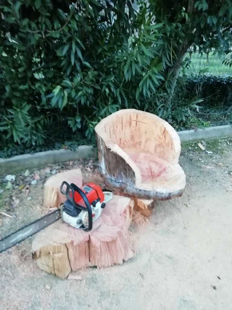 Réalisation d'un fauteuil dans une bille de bois (si quelqu'un reconnais l'essence je suis preneur). Le maniement de la tronçonneuse n'est pas mon point fort a voir le dégâts que j'ai fait. Le piétement en en fer plat de 35x6mm