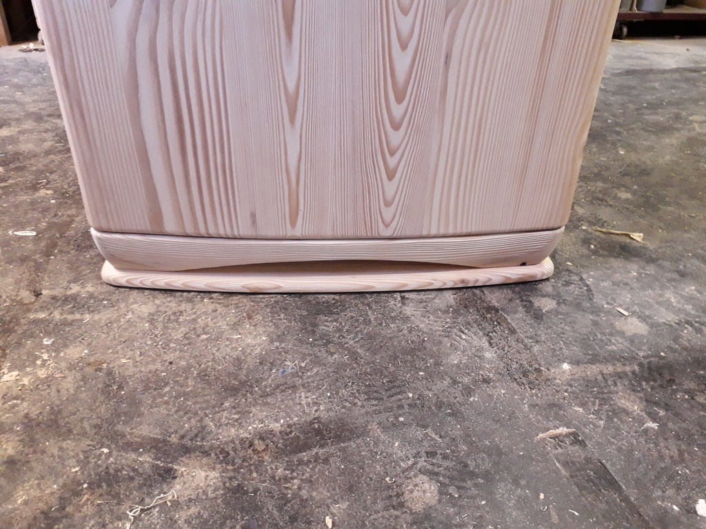 Tous les profils ont été réalisés à la main après montage, j'ai travaillé par tâtonnement afin de bien "sentir" l'avancement de mes profils La porte et le dessus sont galbés. Coté intérieur, on y trouve une étagère fixe qui sert de raidisseur à la carcasse et deux amovibles ainsi qu'un freezer et des rangements dans la porte.