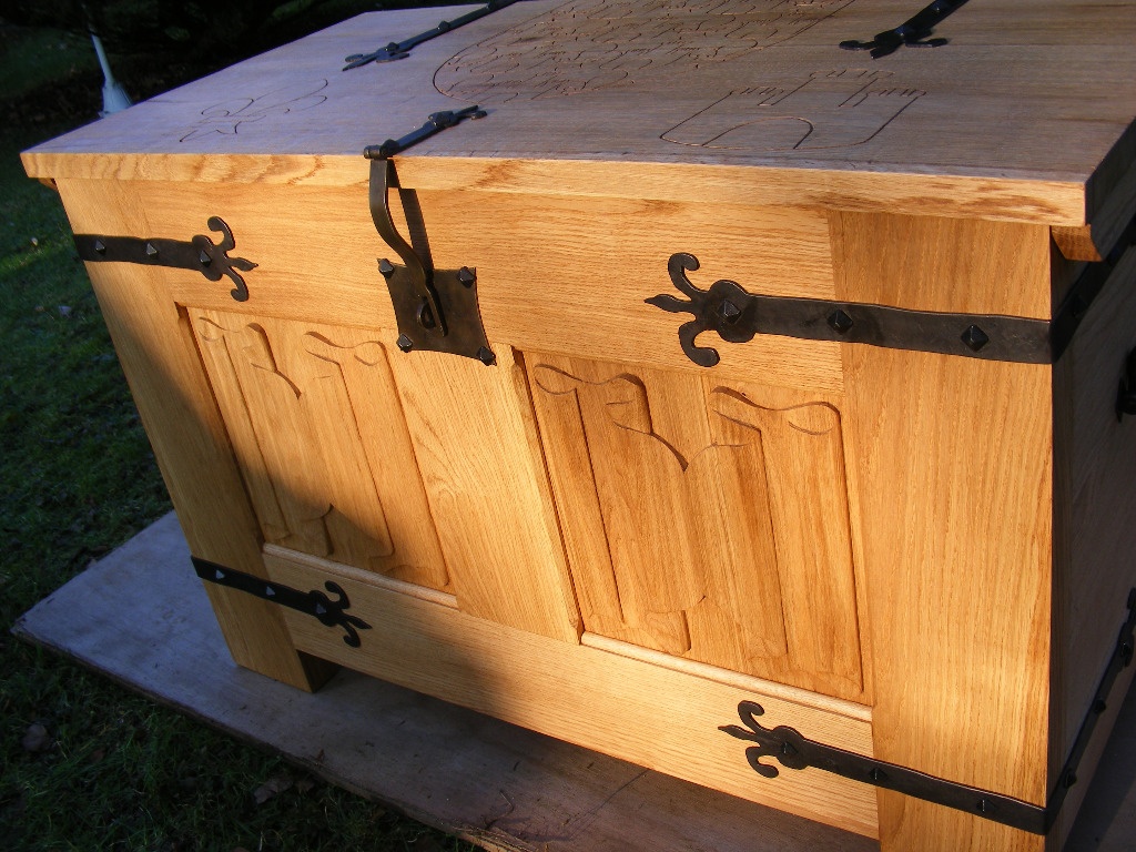 ecto : cet assemblage est fait pour réduire les déformation du coffre ( de 60 kg). Maurped : le "client" ne voulais pas de ferrure à l’arrière. Le fond c'est l’arrière ou la pièce qui est tout en bas du coffre. les assemblages sont rainures languettes, ou tenon mortaises.