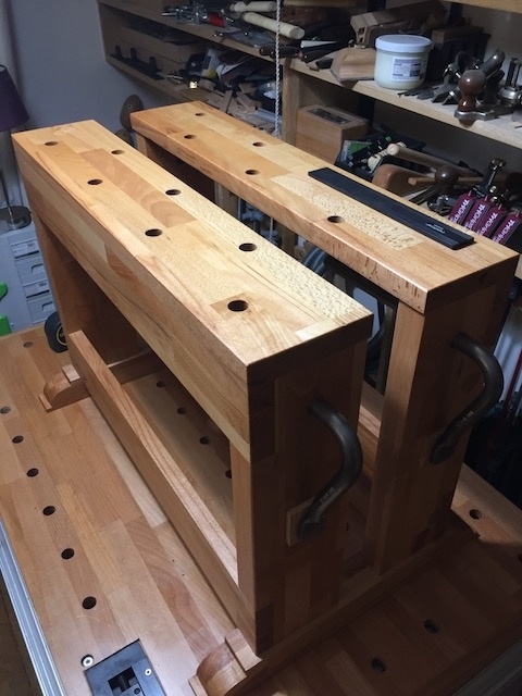 Inspiré directement de celui de Sébastien Gros (T2 WoodWorks), ce banc de sciage a été réalisé à partir de bois de récupération de plateau Ikéa en hêtre. C'est la version "feignasse" cad avec des assemblages domino (sans queue d'aronde). Viendront deux petites servantes pour le tronçonnage des pièces longues...